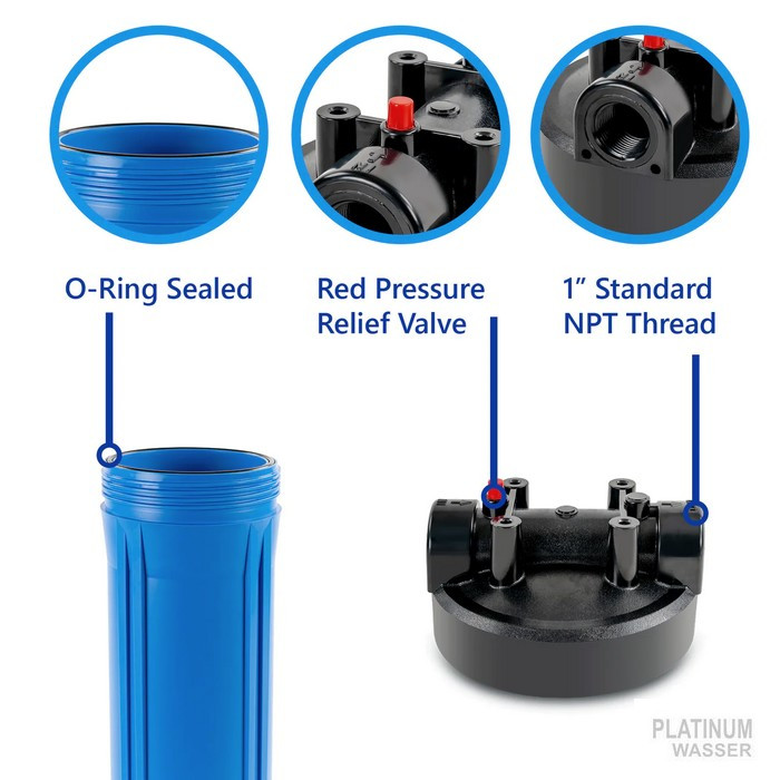 Корпус фільтра BB 10" Platinum Wasser - призначений для очищення холодної води від механічних домішок та іншого роду забруднень. Корпус має типорозмір Big Blue 10 і для нього підходять всі картриджі типорозміру Вig Вlue 20. Корпус фільтра виготовлений з якісного пластику з ребрами жорсткості та ущільнювальною гумкою. Різьблення для підключення - пластикове і має розмір 1". На кришці є повітряний клапан для скидання тиску, що в рази полегшує процедуру заміни картриджа.