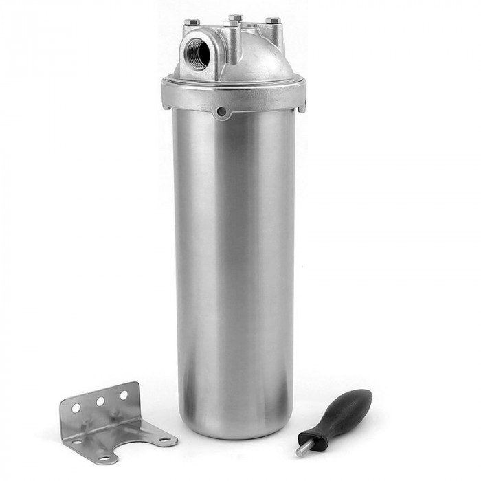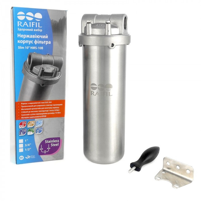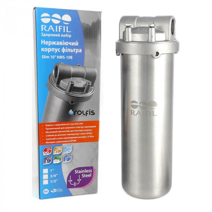 Корпус фільтра Raifil HMS-10B 1/2" (Нержавіюча сталь) - універсальний магістральний корпус фільтра застосовується для очищення холодної або гарячої води за допомогою змінного фільтруючого елемента. Захист сантехніки, побутової техніки, водопровідних труб у котеджах, невеликих житлових будинках, квартир . Встановлюється окремо або як ступінь попереднього очищення перед основним модулем на вході в систему водопостачання.В залежності від використовуваного картриджа очищає воду від різних забруднень.