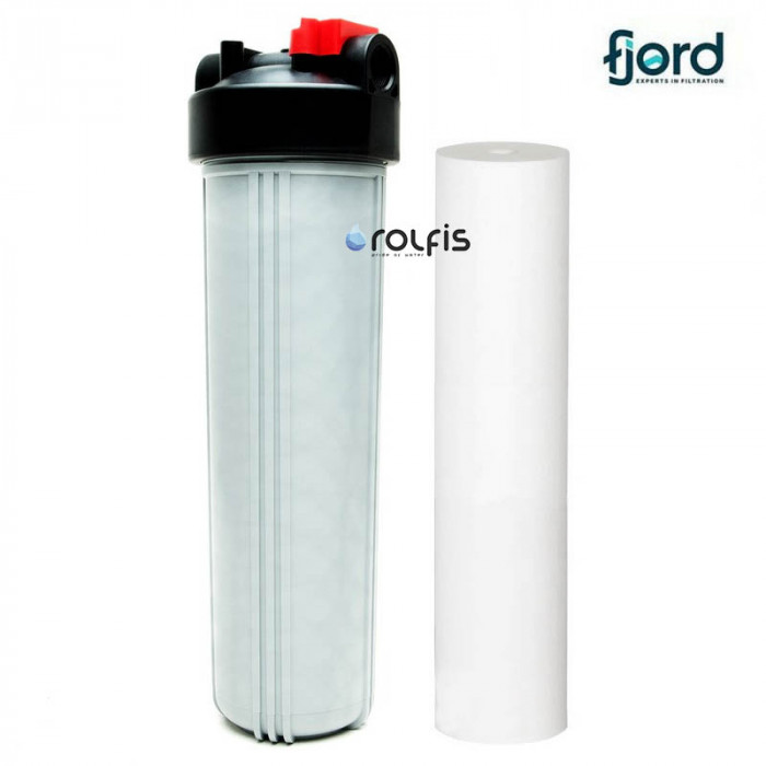 Корпус Fjord Big Blue 20" пласт.різьблення + ПП картридж - магістральна колба типорозміру Big Blue 20 призначена для фільтрації холодної води від різного роду домішок. Колба Fjord Big Blue 20" з діаметром підключення 1 дюйм поставляється з механічним поліпропіленовим картриджем на 20 мкм. Корпус фільтра посилений ребрами жорсткості, які надають йому додаткової міцності, а клапан для стравлювання надлишкового тиску спростить заміну картриджа, що вичерпав свій ресурс.