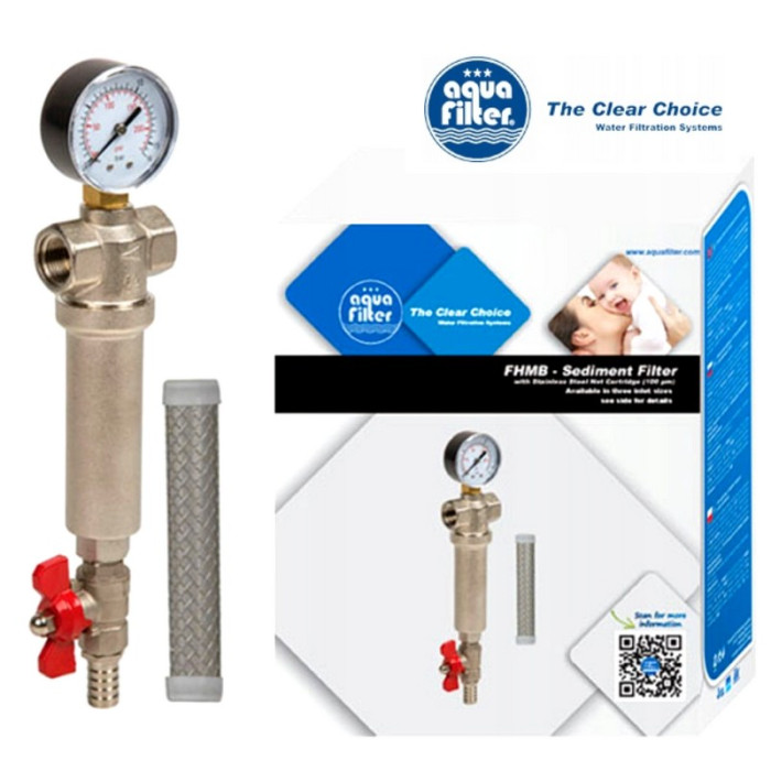 Осадовий фільтр Aquafilter FHMB12-X - латунний механічний фільтр для очищення холодної та гарячої води з різьбленням 1/2", з сіточним картриджем з нержавіючої сталі (100 мкм), датчиком тиску та спускним клапаном. Компактний фільтр грубого очищення Aquafilter F3 - компактний магістральний фільтр для видалення з води зважених частинок, розмір яких перевищує 100 мкм.
