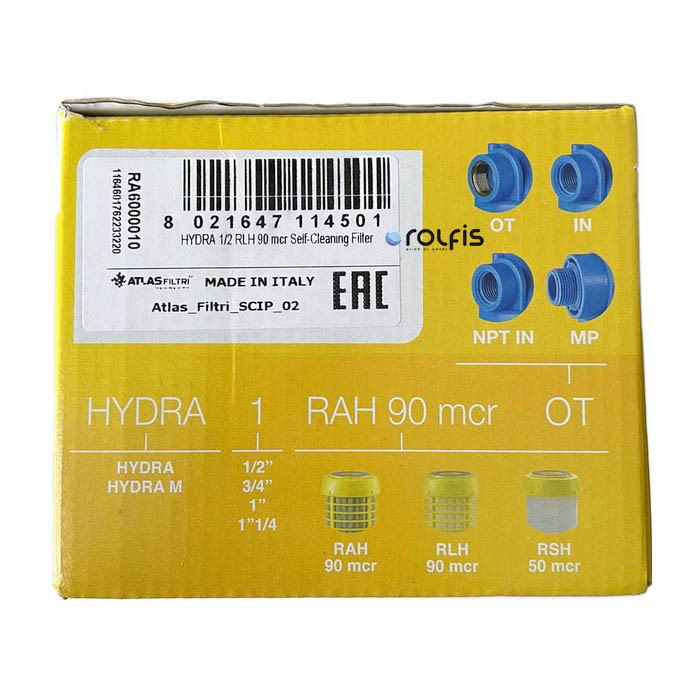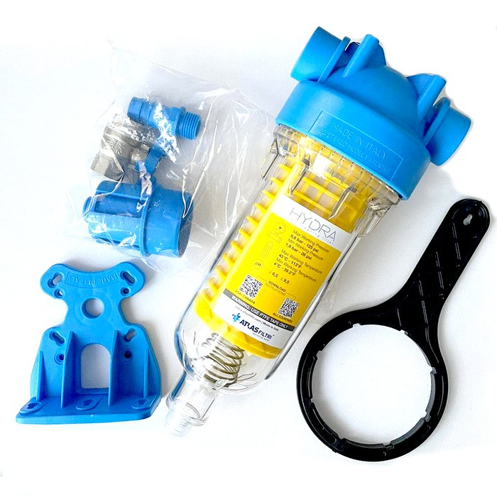 Atlas Filtri Hydra Ø1/2" (латунь) + картридж RLH 90 mcr KIT RA6000010 - магістральний сітчастий фільтр із підключенням 1/2", призначений для попереднього очищення холодної води від різних забруднень розміром не більше 90 мікрон. Фільтруючим елементом є пластмасова сітка 90 мкм.