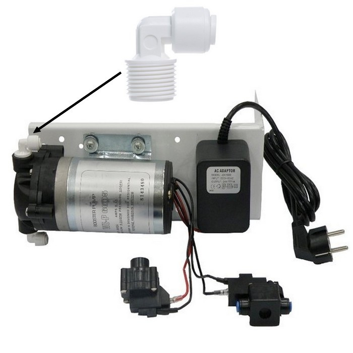 Фітинг кутовий Kaplya KP-ME0406 - кутовий фітинг із зовнішнім різьбленням 3/8" та швидкоз'ємним виходом під шланг 1/4". Даний фітинг часто застосовується для насоса підвищення тиску води в системі зворотного осмосу.