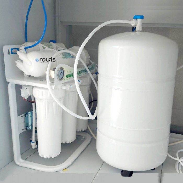 У верхній частині збирається очищена вода. Чиста вода не стикається з металом. У нижню камеру закачано під тиском повітря. За рахунок тиску повітря мембрана роздмухується, що дає можливість повністю спустошувати від води бак.