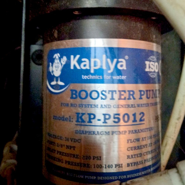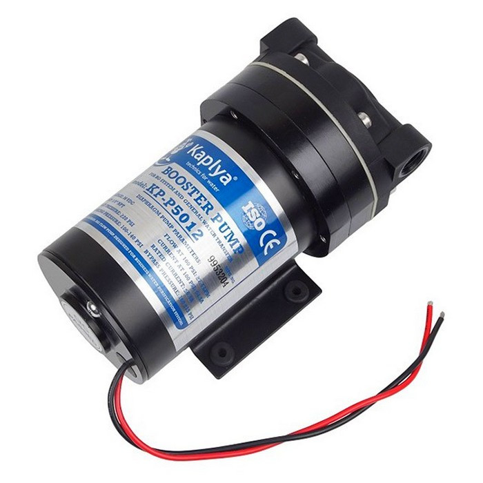 Насос Kaplya KP-P5012 підійде для систем зворотного осмосу високої продуктивності до 1200 GPD. Насос має високу потужність, 6 клапанів. Відкритий потік 9,6 л/хв. При навантаженні PSI 100: потік 7,4 л/хв. Якщо в джерелі подачі води низький тиск, система зворотного осмосу працюватиме некоректно або зовсім не подаватиметься чиста вода на накопичувальний бак і кран на мийці, відповідно!