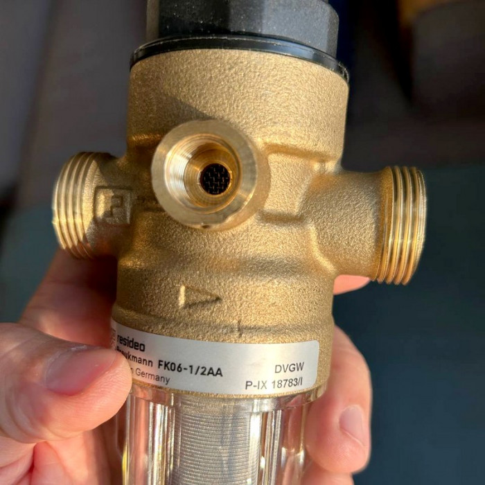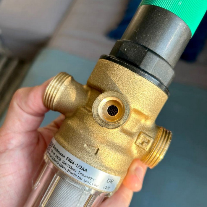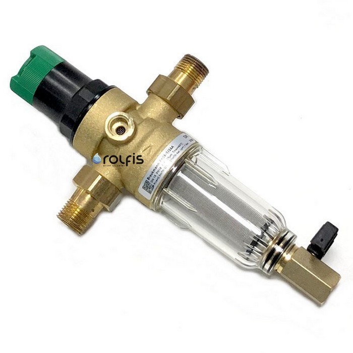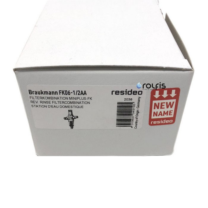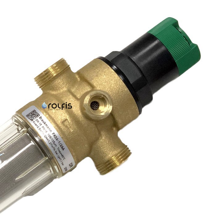Resideo Braukmann FK06-1/2AA - промивний магістральний фільтр з редуктором зниження тиску води забезпечує безперервну подачу очищеної води, в тому числі і під час промивання. Сітка з нержавіючої сталі, яка поміщена в затворний механізм редуктора FK06-1/2AA затримує з води частинки піску, іржі та інших домішок. Редуктор монтується зазвичай на вході системи водопостачання колбою вниз.
