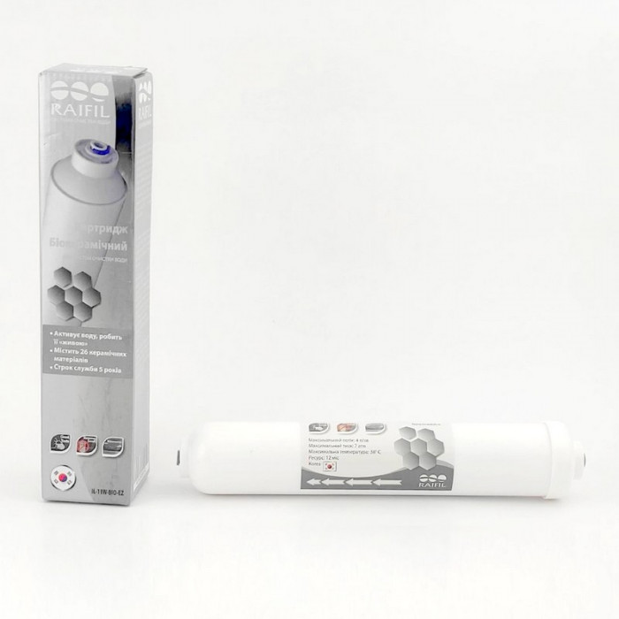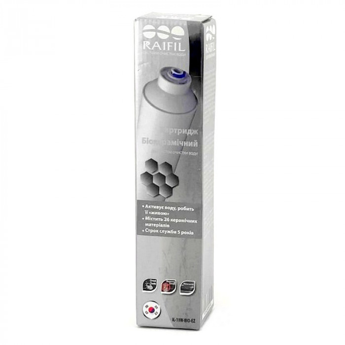 Біокерамічний картридж Raifil IL-11W-BIO-EZ покращує смакові якості води і надає їй біологічно активних властивостей, створюючи ефект «талої води». Як відомо, тала вода має сильні відновлювальні властивості, підвищує захисні функції організму та позитивно впливає на здоров'я. Фільтроелемент містить усередині природні турмалінові кульки, інфрачервоне випромінювання яких сприятливо впливає на імунітет