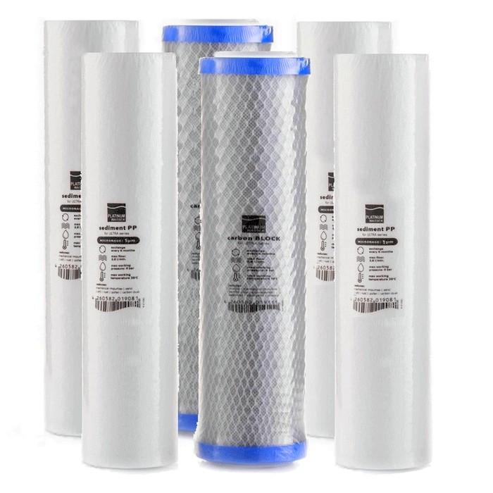 Два комплекти трьох картриджів Platinum Wasser - це набір нижніх картриджів для системи зворотного осмосу. Platinum Wasser – це нова торгова марка від відомого німецького бренду Bluefilters. Фільтри Platinum Wasser виробляються в Європі з використанням матеріалів найвищої якості.