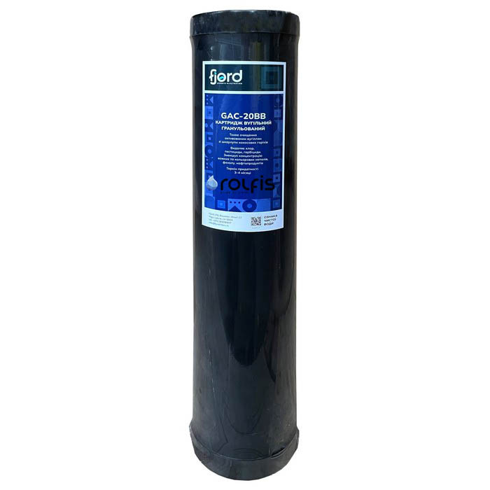 Картридж Fjord GAC-20BB з кокосовим гранульованим вугіллям (4,5х20") – змінний картридж з високоякісним гранульованим активованим вугіллям із шкаралупи кокосового горіха. Призначений для очищення холодної води. Матеріал корпусу - чистий європейський харчовий пластик.