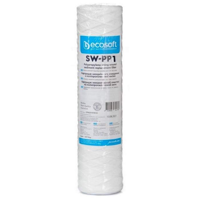 Ecosoft SW-PP1 2,5х10" – змінний фільтруючий елемент з поліпропіленової нитки для магістральних фільтрів, проточних фільтрів та систем зворотного осмосу. Призначений для очищення холодної води від механічних домішок (іржа, пісок, окалина, мул, глина і т.д.) розміром понад 1 мікрон.