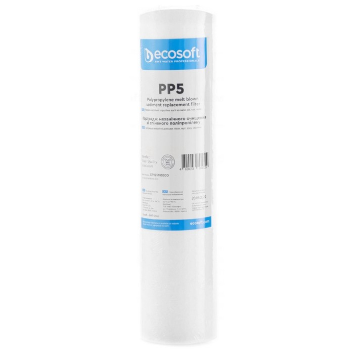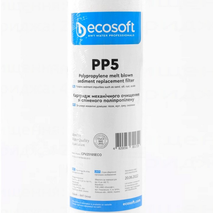 Ecosoft PP5 2,5х10" CPV25105ECO – змінний фільтруючий елемент з поліпропіленового волокна для магістральних фільтрів, проточних фільтрів та систем зворотного осмосу. Призначений для очищення холодної води від механічних домішок (іржа, пісок, окалина, мул і т.д.).