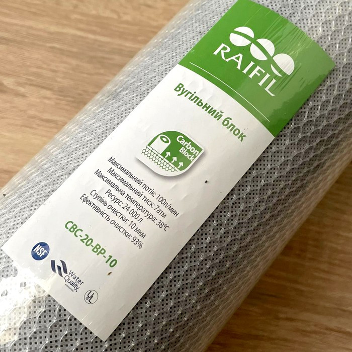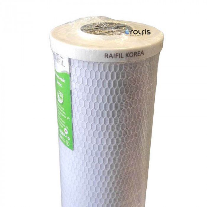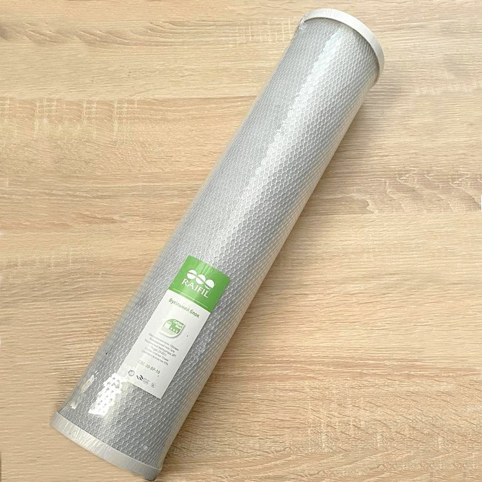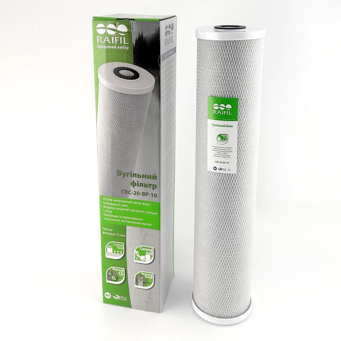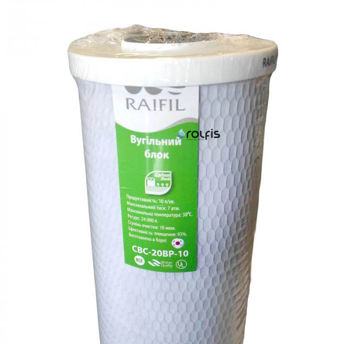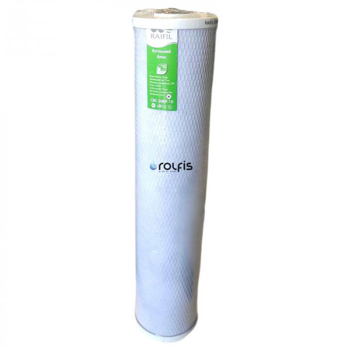 Raifil CBC-20-BP-10 - картридж типорозміру Big Blue 20, виготовлений з високоякісного кокосового активованого спресованого вугілля. Він видаляє з води хлор, його сполуки, пестициди, гербіциди, органічні речовини та деякі метали (бензольні сполуки), гази. Покращує смакові якості води (колір, запах води).
