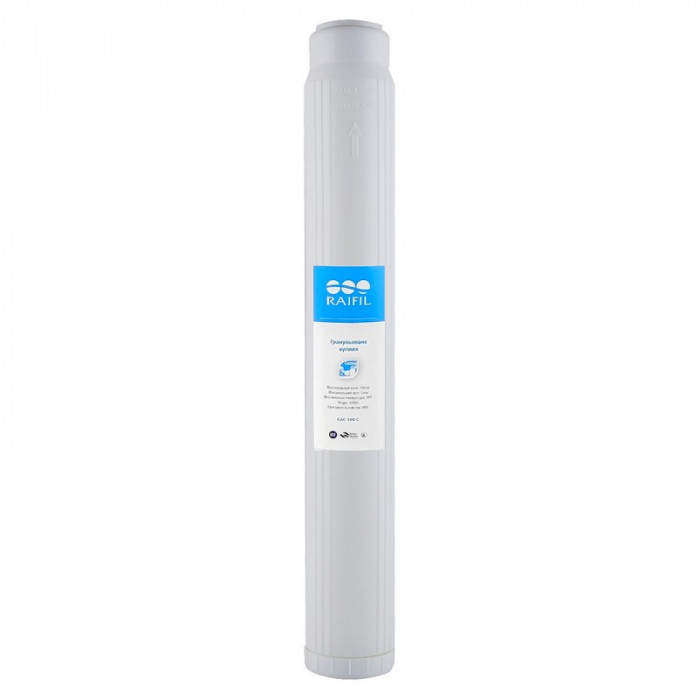 Картридж гранульований Raifil GAC-20R-C - картридж типорозміру Slim 20 (20х2,5"), виготовлений з високоякісного кокосового активованого гранульованого вугілля. Вугільний гранульований картридж GAC-20R-C видаляє з води хлор, його сполуки, пестициди і деякі метали (бензольні сполуки), гази, покращує смакові якості води (колір, запах води).