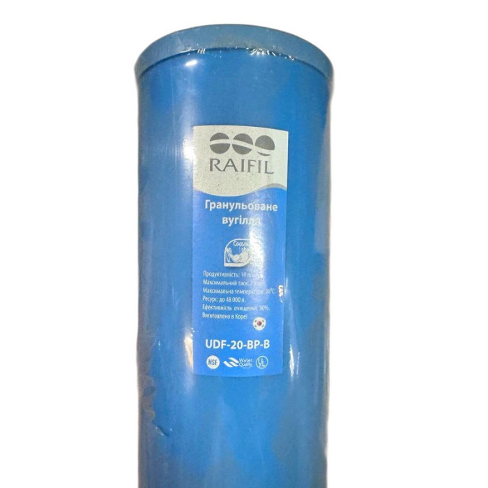 Картридж вугільний Raifil UDF-20-BP-B - картридж типорозміру Big Blue 20, виготовлений з високоякісного кокосового активованого гранульованого вугілля.Він видаляє з води хлор, його сполуки, пестициди, гербіциди, органічні речовини та деякі метали (бензольні сполуки), гази. Покращує смакові якості води (колір, запах води).