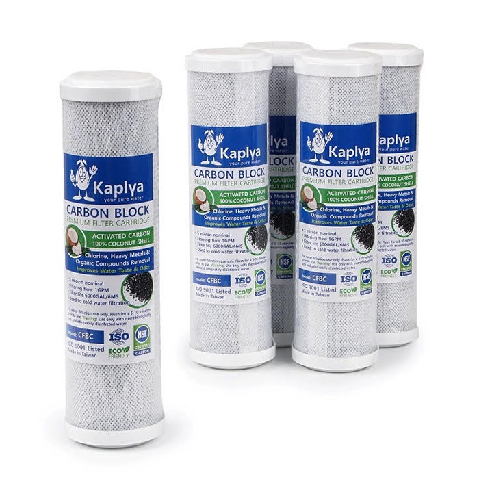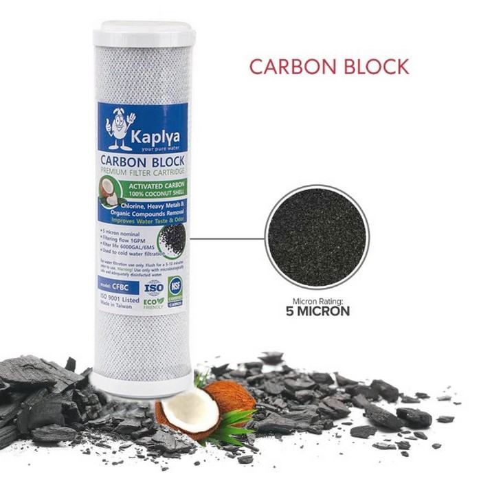 Картридж Kaplya CFBC - картридж стандартного розміру Slim 10. Виготовлений зі 100% кокосового спеченого активованого вугілля. Може використовуватись у будь-якій стандартній колбі Слім10. Kaplya CFBC видаляє з води хлор, органічні домішки та важкі метали. Так само, через те, що вугілля пресоване, картридж має механічне очищення 5 мікрон.