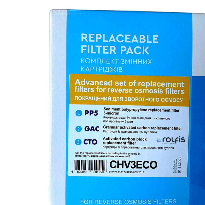 1. Покращений комплект картриджів CHV3ECO для зворотного осмосу Absolute. Очищає воду від хлору та механічних домішок, перед подачею води на мембрану зворотного осмосу.