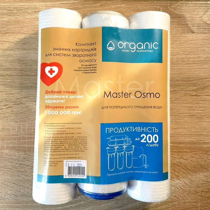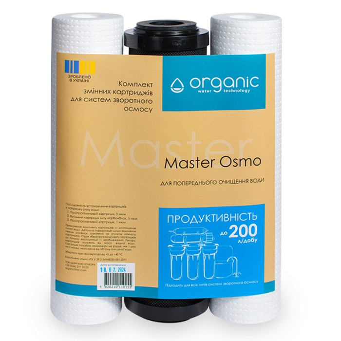 Organic Master Osmo - комплект трьох картриджів для систем зворотного осмосу Organic Master Osmo. Картриджі призначені для попереднього очищення води перед мембраною зворотного осмосу.
