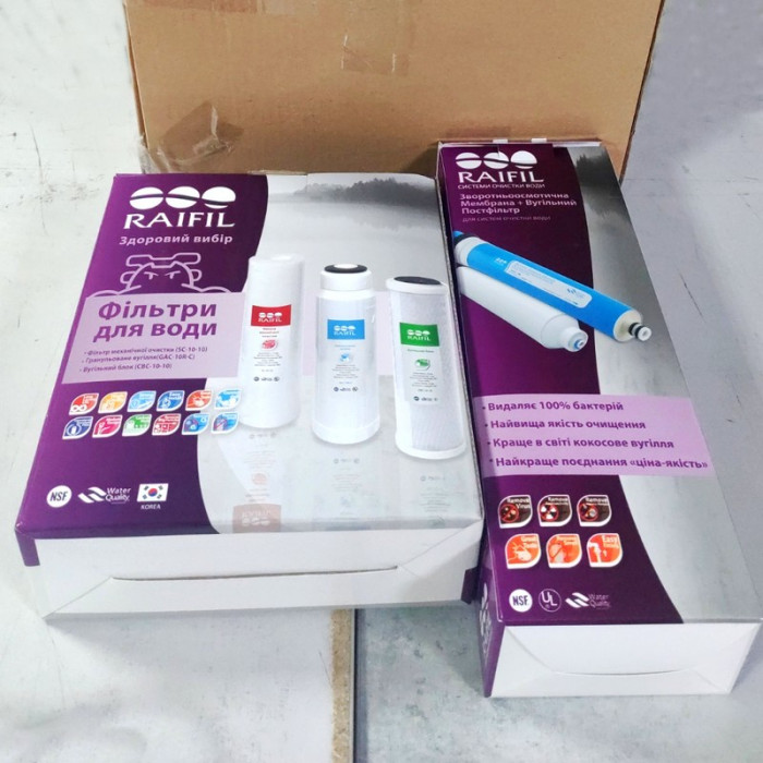 Комплект п'яти картриджів Raifil 75 GPD - це набір стандартних картриджів, які підходять як до системи зворотного осмосу Railfil GRANDO 5, так і до інших виробників. В даний набір картриджів Raifil входять 3 картриджі євростандарту розміром 25,5х6 см, один постфільтр (швидкознімний) і зворотноосмотична мембрана на 75 галон: