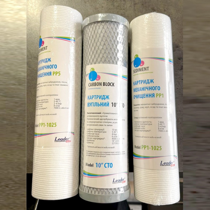 - Leader PP-1 - картридж механічного очищення води, мікронаж становить 1 мкм, використовується третім ступенем передочищення води перед осмотичною мембраною, для запобігання потраплянню до неї дрібних механічних забруднень.