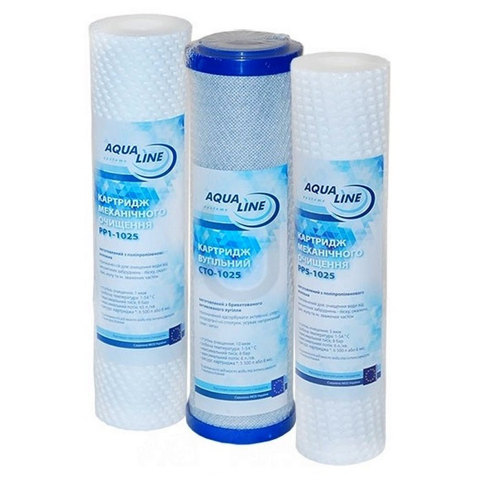 Комплект із трьох картриджів для очистки води в системах зворотного осмосу Aqualine, а також в інших зворотноосмотичних фільтрах для води.