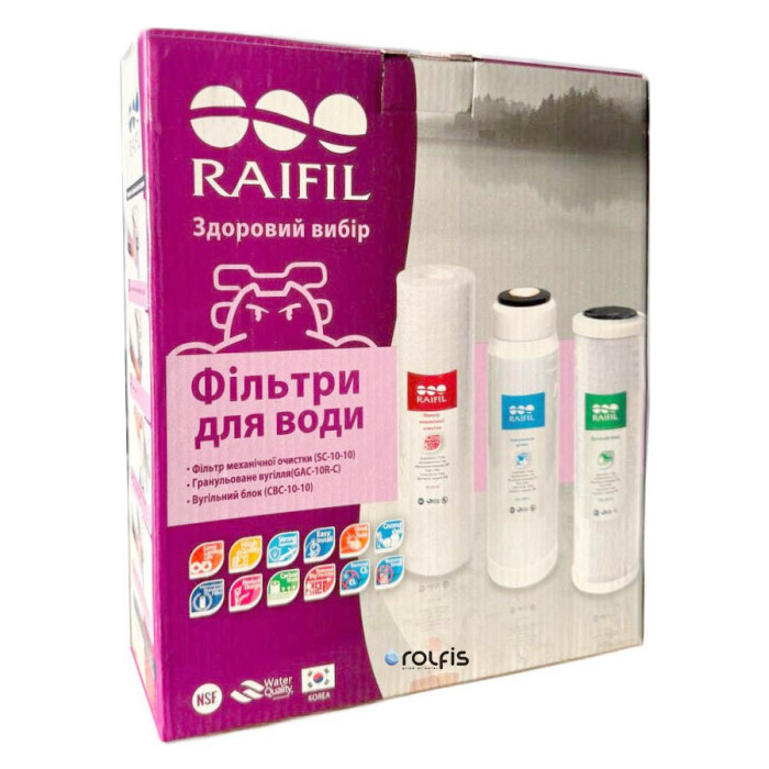 Комплект картриджів Raifil 1-2-3 Coal Trio Box - три змінні картриджі для попереднього очищення води в системі зворотного осмосу торгової марки Райфіл, а також для інших систем зворотного осмосу з типорозміром картриджів 2,5 х 10 дюймів. Цей комплект картриджів можна використовувати для проточних фільтрів із трьома етапами очищення.