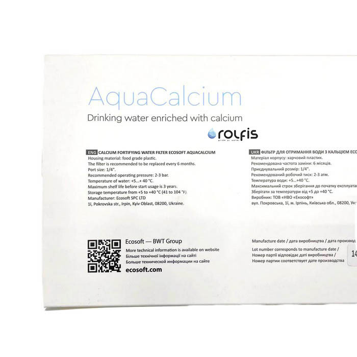 Мінералізатор AquaCalcium поповнює організм людини природними солями кальцію легко доступною для засвоєння форм. Призначений для використання у системі зворотного осмосу ECOSOFT P'URE AquaCalcium, схема якого імітує природну швидкість проходження води через гірські породи та забезпечує постійний вміст мінералів у очищеній воді.