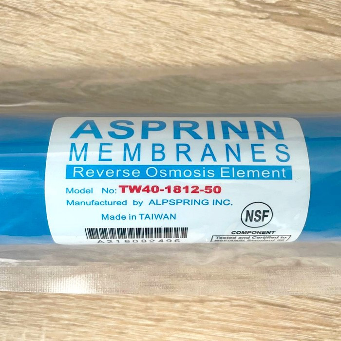 Asprinn TW40-1812-50 - мембрана для систем зворотного осмосу продуктивністю 50 галон на добу (близько 180 л/добу). Виробляються мембрани Aspring у Тайвані згідно сертифікату NSF, що гарантує якість даного мембранного елемента для фільтрації води.