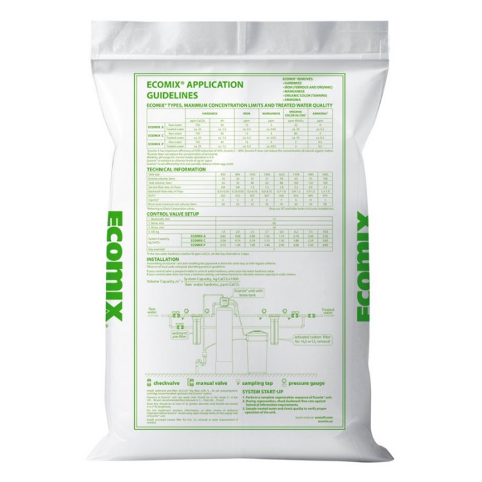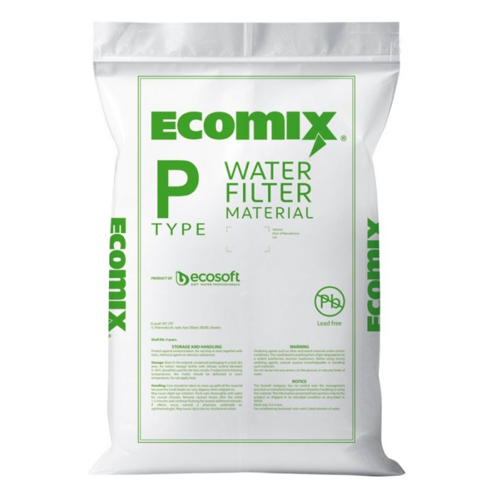 Ecomix® P (ECOMIXP12) - фільтруюче іонообмінне завантаження для комплексного очищення води, переважно використовується для очищення складної води з перевищенням допустимих показників за кількома домішками, такими як солі жорсткості, сполуки заліза та інші. Використання даного фільтруючого матеріалу дозволяє з'єднати 2-3 фільтри в одному, тим самим отримати перевагу в компактності рішення очищення та фінансову вигоду.